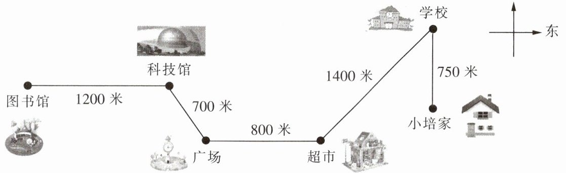 小培从图书馆向()走()米到科技馆,然后向()走()米到广场,再向()走()米到超市,再向()走()米到学校,最后向()走()米回到家。