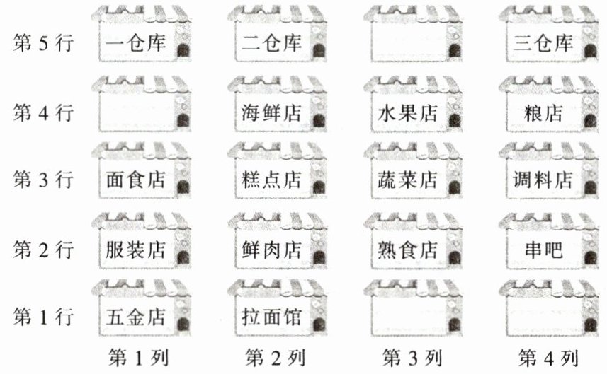 (2)服装店在第( )列、第( )行,用数对表示为( , )。