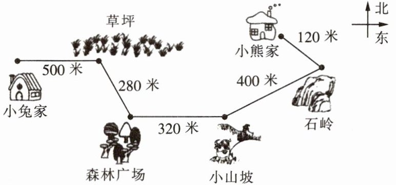 (2)小熊先向东南走120米到石岭,再向西南走400米到小山坡,再向西走320米到森林广场,再向西北走280米到草坪,最后向西走500米到小兔家。