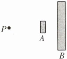3. 如图所示,有两堵墙$A和B$。当灯$P$亮起时,请你画出$A墙在B$墙上留下的影子的范围。