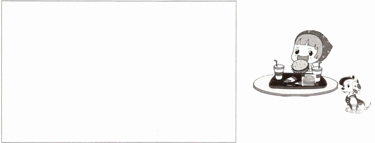 3. 小美正在吃午餐,桌子上摆了好多食物,这时候,机灵狗来了,它趴在桌角张望。想一想它能看到哪些食物,简要地把它画在下面的方框内。