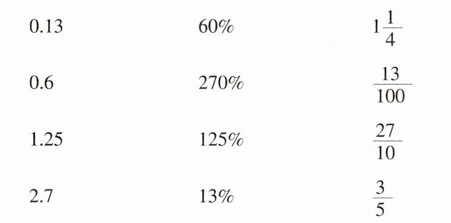 $0.13-13\%-\frac{13}{100}$ $0.6-60\%-\frac{3}{5}$ $1.25-125\%-1\frac{1}{4}$ $2.7-270\%-\frac{27}{10}$