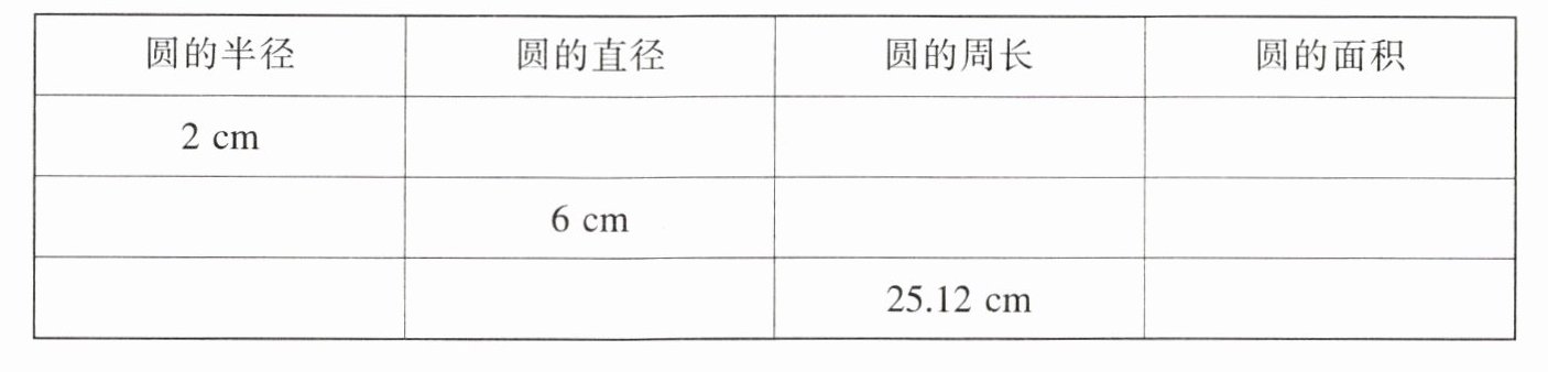 |圆的半径|圆的直径|圆的周长|圆的面积|----|----|----|----|2 cm|4 cm|12.56 cm|12.56 cm²|3 cm|6 cm|18.84 cm|28.26 cm²|4 cm|8 cm|25.12 cm|50.24 cm²|