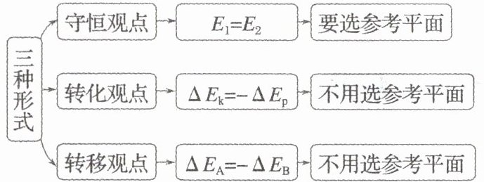 守恒观点:$E_1 = E_2$(选参考平面);转化观点:$\Delta E_k=-\Delta E_p$(不选参考平面)