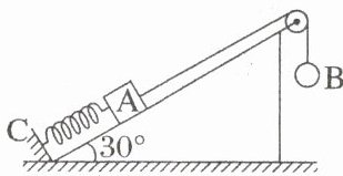 如图所示,在倾角为$30^{\circ}$的光滑固定斜面上,一劲度系数为$k = 200 \mathrm{~N} / \mathrm{m}$的与斜面平行的轻质弹簧一端连接在固定挡板$\mathrm{C}$上,另一端连接一质量为$m = 4 \mathrm{~kg}$的物体$\mathrm{A}$,一轻细绳绕过轻质定滑轮,一端系在物体$\mathrm{A}$上,另一端与质量也为$m$的小球$\mathrm{B}$相连,细绳与斜面平行,斜面足够长。用手托住小球$\mathrm{B}$使细绳伸直且刚好没有拉力,然后由静止释放,不计一切阻力,重力加速度$g$取$10 \mathrm{~m} / \mathrm{s}^{2}$。求: