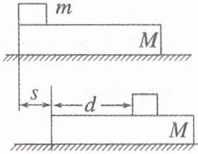 (多选)如图所示,一个长为 L、质量为 M 的木板,静止在光滑水平面上,一个质量为 m 的物块(可视为质点)以水平初速度 v₀从木板的左端滑向另一端,设物块与木板间的动摩擦因数为 μ,当物块与木板相对静止时,物块仍在长木板上,物块相对木板的位移为 d,木板相对地面的位移为 s,重力加速度为 g。则在此过程中 (