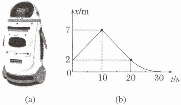 (2025·山东泰安市肥城市开学考)图(a)所示的医用智能机器人在巡视中沿医院走廊做直线运动,图(b)是该机器人在某段时间内的位移—时间图像(后 10 s 的图线为曲线,其余为直线)。以下说法正确的是(
