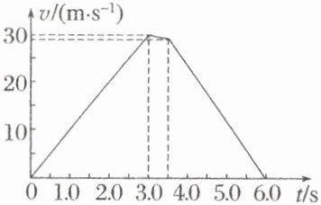 (2024·福建卷·3)某公司在封闭公路上对一新型电动汽车进行直线加速和刹车性能测试,某次测试的速度—时间图像如图所示。已知 $ 0 \sim 3.0 \ s $ 和 $ 3.5 \sim 6.0 \ s $ 内图线为直线,$ 3.0 \sim 3.5 \ s $ 内图线为曲线,则该车(
