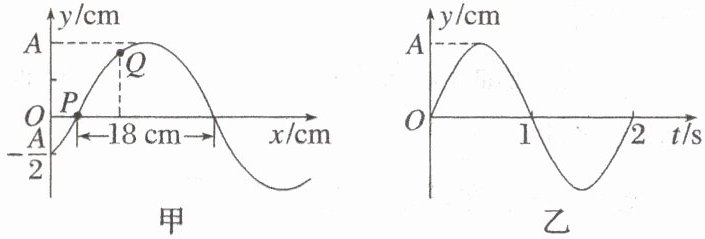 C [由题图甲可以看出,该波的波长为$\lambda = 36cm$,由题图乙可以看出周期为$T = 2s$,波速为$v = \frac{\lambda}{T} = 18cm/s$,A错误;当$t = \frac{1}{3}s$时,Q点向上运动,结合题图甲根据“上下坡”法可得波沿x轴负方向传播,B错误;由题图甲可知,$x = 0$处,$y = -\frac{A}{2} = A\sin(-30^{\circ})$,则$x_P = \frac{30^{\circ}}{360^{\circ}}\lambda = 3cm$,由题图乙可知,$t = 0$时,质点Q处于平衡位置,经过$\Delta t = \frac{1}{3}s$,其振动状态向x轴负方向传播到P点处,则$-x_P = v\Delta t = 18 × \frac{1}{3}cm = 6cm$,则$x = 9cm$,C正确;波沿x轴负方向传播,而质点P只会在平衡位置附近振动,不会随波迁移,D错误。]