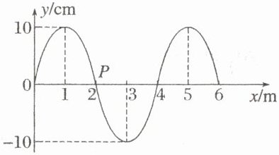(来自人教教材)一列简谐横波在$t = 0$时的波形图如图所示。介质中$x = 2$ m处的质点$P$沿$y$轴方向做简谐运动的表达式为$y = 10\sin(5\pi t)$($y$的单位是cm)。