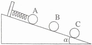 如图所示,在倾角为$\alpha$的光滑绝缘斜面上固定一个挡板,在挡板上连接一根与斜面平行的劲度系数为$k_{0}$的绝缘轻质弹簧,弹簧另一端与A球连接。A、B、C三小球的质量均为$M$,$q_{A} = q_{0} > 0$,$q_{B} = -q_{0}$,当系统处于静止状态时,三小球等间距排列。已知静电力常量为$k$,重力加速度为$g$,则(
