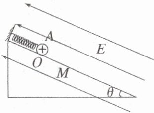 (2024·河南周口市联考)如图所示,劲度系数为 $k$ 的轻弹簧,一端固定于倾角为 $\theta$ 的光滑绝缘斜面顶端的挡板上,另一端连接绝缘带正电可视为质点的小球 $A$,弹簧与斜面平行,小球的质量为 $m$,电荷量为 $q$,弹簧处于原长时小球在 $O$ 点。在空间中加一平行于斜面向上的匀强电场,电场强度大小为 $E$,将小球从 $O$ 点由静止释放,小球沿斜面运动至 $M$ 点时加速度为零,重力加速度为 $g$,则小球从 $O$ 点运动至 $M$ 点过程中,小球的(