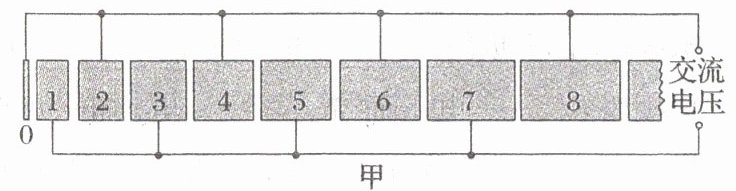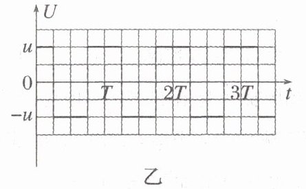 如图甲为直线加速器原理图,由多个横截面积相同的金属圆筒依次排列,其中心轴线在同一直线上。序号为奇数的圆筒和交流电源的一个极相连,序号为偶数的圆筒和该电源的另一个极相连。交流电源两极间电势差的变化规律如图乙所示。已知电子的质量为 m、元电荷为 e、电压的绝对值为 u,周期为 T,电子通过圆筒间隙的时间可以忽略不计。在 t = 0 时,奇数圆筒相对偶数圆筒的电势差为正值,此时位于和偶数圆筒相连的金属圆板(序号为 0)中央有一个初速度为零的电子。下列说法正确的是(