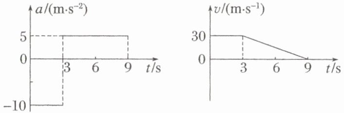 C 在$0~3s$内A车做匀减速运动,A车减速到零所需时间$t_A = \frac{v_0}{a_{A1}} = 3s$,故在$t = 3s$时A车减速到零,A车前进的位移为$x_A = \frac{v_0}{2}t_A = 45m$,B车前进的位移为$x_B = v_0t_A = 90m$,$t = 3s$时两车间距离为$\Delta x = d + x_A - x_B = 55m$,故A错误;由题图可知在$3~9s$内A车的加速度为$a_{A2} = 5m/s^2$,在$v - t$图像中,图像的斜率表示加速度,则$a_B = \frac{\Delta v}{\Delta t} = -5m/s^2$,故A、B两车的加速度大小相等,故B错误;$t = 3s$后,A车开始由静止做匀加速运动,B车开始做匀减速运动,$3~9s$的过程中,设经历时间$t$两者速度相同,则$v_{共} = a_{A2}t = v_0 + a_Bt$,解得$t = 3s$,$v_{共} = 15m/s$,A车在$t = 3s$内前进的位移为$x_1 = \frac{v_{共}}{2}t = 22.5m$,B车前进的位移为$x_2 = \frac{v_0 + v_{共}}{2}t = 67.5m$,故此时两车相距的最小距离为$\Delta x_{min} = \Delta x + x_1 - x_2 = 10m$,此后A车的速度大于B车的速度,两者间的距离开始增大,故不可能相遇,故C正确,D错误。