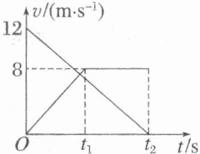 B 设运动员加速时间为$t_1$,追上时两者位移相等,即$v - t$图像与$t$轴所围面积相等,有$\frac{1}{2}×12×t_2 = \frac{1}{2}×8×t_1 + 8×(t_2 - t_1)$,解得$t_2 = 2t_1$,则加速度之比$\frac{a_1}{a_2} = \frac{t_2}{8} = \frac{3t_1}{2t_2} = \frac{3}{4}$,故选B。