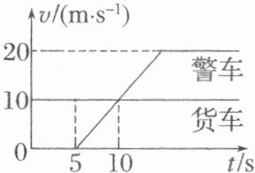 B $v - t$图像的斜率表示加速度,则警车的加速度大小为$a = \frac{\Delta v}{\Delta t} = \frac{10}{10 - 5}m/s^2 = 2m/s^2$,故A错误;警车加速到最高速度所用的时间为$t_1 = \frac{v}{a} = \frac{20m/s}{2m/s^2} = 10s$,所以警车在$t = 20s$时的位移为$x_{警} = \frac{1}{2}at_1^2 + vt_2 = \frac{1}{2}×2×10^2m + 20m/s×(20s - 5s - 10s) = 200m$,而货车在$t = 20s$时的位移为$x_{货} = v_{货}t = 10×20m = 200m$,可知$x_{警} = x_{货}$,说明在$t = 20s$时警车恰好能追上货车,故B正确,D错误;在警车速度小于货车时,两车距离变大,在警车速度大于货车后,两车距离变小,所以在警车速度等于货车速度时,两车距离最大,即$t = 10s$两车距离最大,则追赶过程中两车的最大距离是$d = x_{货1} - x_{警1} = 10×10m - \frac{1}{2}×2×5^2m = 75m$,故C错误。