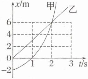 D 在$x - t$图像中,图线的斜率表示速度,由题图可知,$t = 2s$时刻甲车的速度大于乙车的速度,故A错误;由题图知,$0~2s$内,甲车位移为$8m$,乙车位移为$6m$,甲车位移大于乙车位移,故B错误;由乙车$x - t$图线可知,乙车做匀速直线运动,速度大小为$v_乙 = 3m/s$,甲车的位移表达式为$x = v_0t + \frac{1}{2}a_1t^2 + x_0$,将$(0,-2)$、$(1,0)$、$(2,6)$代入上式,解得$x_0 = -2m$,$v_0 = 0$,$a_1 = 4m/s^2$,故C错误;两车速度相同时,相距最远,即$v_甲 = v_乙 = 3m/s$,则$t = \frac{v_甲}{a_1} = 0.75s$,故D正确。