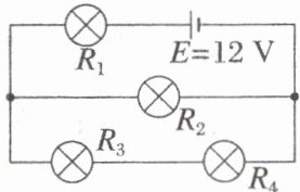 (2022·江苏卷·2)如图所示,电路中灯泡均正常发光,阻值分别为 $R_1 = 2\ \Omega$,$R_2 = 3\ \Omega$,$R_3 = 2\ \Omega$,$R_4 = 4\ \Omega$,电源电动势 $E = 12\ V$,内阻不计,四个灯泡中消耗功率最大的是 (