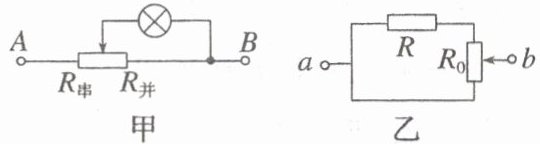 (4)在一个定值电阻$R$和一个可变电阻$R_{0}$组成的如图乙所示的电路中,两支路电阻越趋于相等,乙图中电路电阻越大,两支路电阻相等时,乙图中电路电阻最大。
