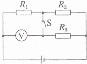 如图所示的电路中,$R_{1}=2\Omega$,$R_{2}=3\Omega$,$R_{3}=6\Omega$,电压表为理想电表,当开关$S$断开时,电压表示数为$5.0V$;当开关$S$闭合时,电压表示数为$2.4V$,求电源的电动势$E$和内电阻$r$。