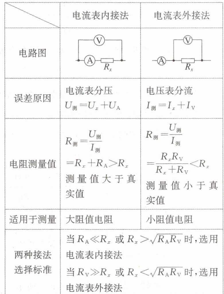 ② 减小方法:根据$R_x$约值选合适器材,当$R_x \ll R_V$(电压表内阻)时用电流表外接法,当$R_x \gg R_A$(电流表内阻)时用电流表内接法。