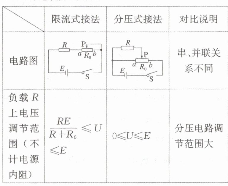 | 负载$R$上电压调节范围(不计电源内阻) | $\frac{RE}{R + R_0}\leq U\leq E$ | $0\leq U\leq E$ | 分压电路调节范围大 |