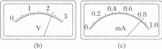 (3) 测量多组数据可得$ R_x $的伏安特性曲线。若在某次测量中,电压表、电流表的示数分别如图(b)和图(c)所示,则此时$ R_x $两端的电压为V,流过$ R_x $的电流为mA,此组数据得到的$ R_x $的阻值为Ω(保留 3 位有效数字)。