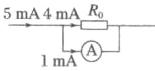 (2)电路中R应选最大阻值为10Ω的滑动变阻器,方便电路的调节,测量效率高、实验误差小; 通过R_x的电流最大为5mA,需要将电流表量程扩大为原来的5倍,根据并联分流的规律示意图如图。 并联电路中电流之比等于电阻的反比,可知$\frac{4mA}{1mA}$=$\frac{300}{R₀}$,解得R₀=75Ω。