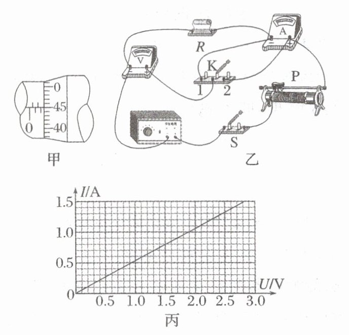 $ mm $;(2) 把待测铅笔芯接入图乙所示电路,闭合开关 $ S $ 后,将滑动变阻器滑片由最右端向左调节到合适位置,将单刀双掷开关 $ K $ 分别掷到 $ 1 $、$ 2 $ 端,观察到电压表示数变化比电流表示数变化更明显,则测量铅笔芯电阻时应将 $ K $ 掷到__________(填“$ 1 $”或“$ 2 $”)端;