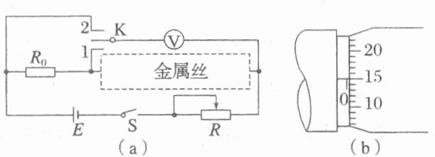 一学生小组测量某金属丝(阻值约十几欧姆)的电阻率。现有实验器材:螺旋测微器、米尺、电源 $ E $、电压表(内阻非常大)、定值电阻 $ R_{0} $(阻值 $ 10.0 \, \Omega $)、滑动变阻器 $ R $、待测金属丝、单刀双掷开关 $ K $、开关 $ S $、导线若干。图(a)是学生设计的实验电路原理图。完成下列填空: