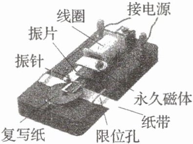 使用4-6V交流电源,通过线圈、振片、振针的振动及复写纸在纸带上打点,永久磁体提供磁场,限位孔限制纸带方向。
