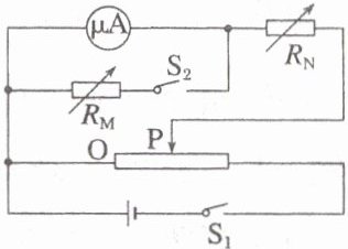 (6)某次半偏法测量表头内阻的实验中,$ S_2 $ 断开,电表满偏时读出 $ R_{N} $ 值,在滑动头 $ P $ 不变,$ S_2 $ 闭合后调节电阻箱 $ R_{M} $,使电表半偏时读出 $ R_{M} $,若认为 $ OP $ 间电压不变,则微安表内阻为