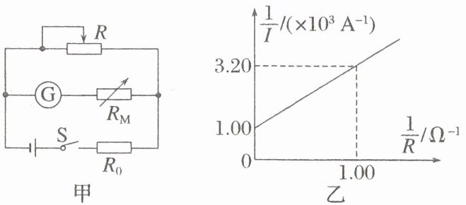 (3)根据闭合电路的欧姆定律$E = U+\frac{U}{R}(R_0 + r)$,且$U = I(R_G + R_M)$,整理得$\frac{1}{I}=\frac{6000(R_0 + r)}{E}\cdot\frac{1}{R}+\frac{6000}{E}$,$\frac{1}{I}-\frac{1}{R}$图像的纵截距为$b=\frac{6000}{E}=1.00×10^3$,解得光电池的电动势$E = 6.00V$,$\frac{1}{I}-\frac{1}{R}$图像的斜率为$k=\frac{6000(R_0 + r)}{E}=\frac{3.20 - 1.00}{1.00 - 0}×10^3$,解得光电池的内阻$r = 1.20\Omega$。