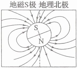 ① 地磁的 $ N $ 极在地理附近,$ S $ 极在地理附近,磁感线分布如图所示。