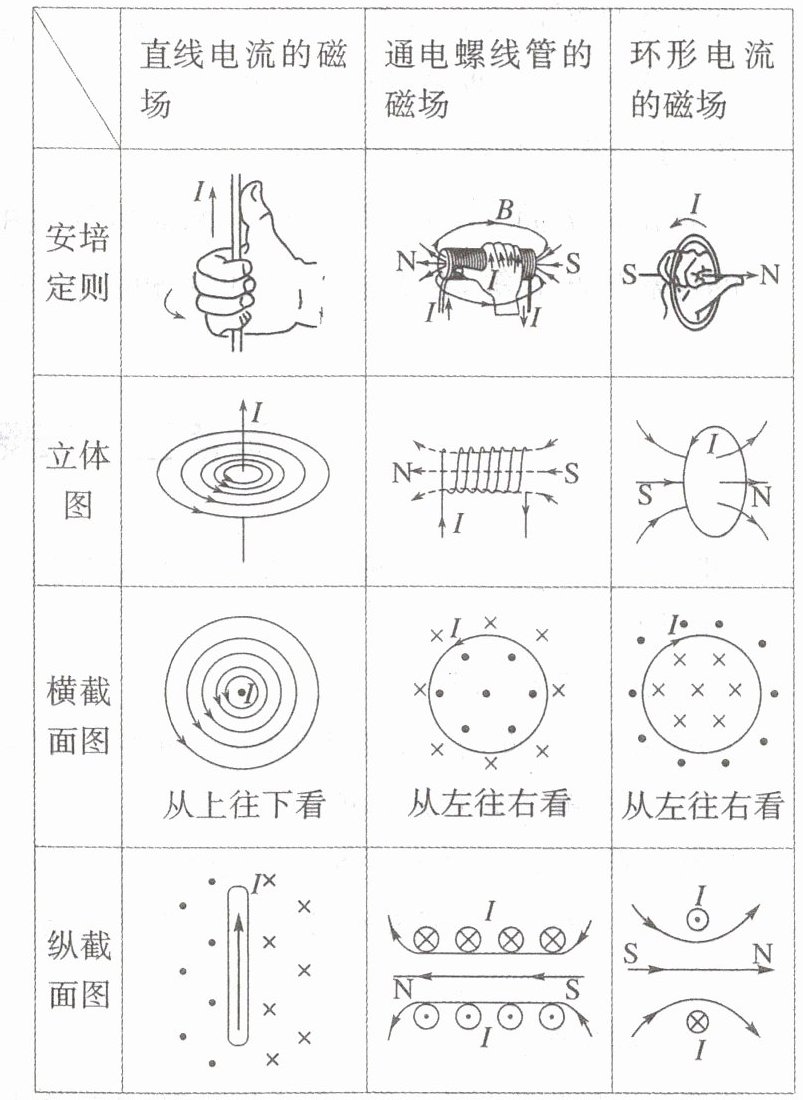 (1)条形磁体磁场外部磁感线从N极到S极,内部从S极到N极;蹄形磁体两极间磁场较均匀。(2)直线电流磁场为同心圆,安培定则判定方向;通电螺线管磁场类似条形磁体,内部匀强;环形电流磁场类似小磁针,均用安培定则判定方向。