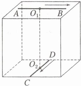 (2025·广东省广雅中学月考)一光滑绝缘的正方体固定在水平面内。$ AB $ 导体棒可绕过其中点的转轴在正方体的上表面内自由转动,$ CD $ 导体棒固定在正方体的下底面。开始时两棒相互垂直并静止,两棒中点 $ O_1O_2 $ 连线在正方体的中轴线上。现对两棒同时通有图示($ A $ 到 $ B $、$ D $ 到 $ C $)方向的电流。下列说法中正确的是(