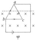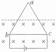 (2025·浙江湖州市联考)等边三角形导线框 $ abc $ 由三根相同的导体棒连接而成,过 $ ab $ 边和 $ ac $ 边中点的虚线下方存在着垂直于导线框平面的匀强磁场,如图所示。线框顶点 $ b $、$ c $ 与直流电源两端相连,已知导体棒 $ bc $ 受到的安培力大小为 $ F $,则(