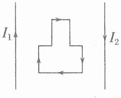 (2024·贵州卷·5)如图,两根相互平行的长直导线与一“凸”形导线框固定在同一竖直平面内,导线框的对称轴与两长直导线间的距离相等。已知左、右两长直导线中分别通有方向相反的恒定电流 $ I_1 $、$ I_2 $,且 $ I_1 > I_2 $,则当导线框中通有顺时针方向的电流时,导线框所受安培力的合力方向(