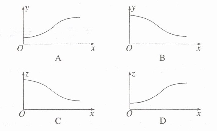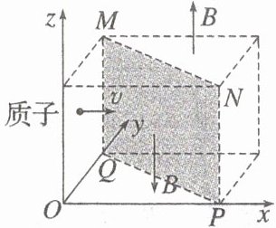 如图所示,一个立方体空间被对角平面 $MNPQ$ 划分成两个区域,两区域分布有磁感应强度大小相等、方向相反且与 $z$ 轴平行的匀强磁场。一质子以某一速度从立方体左侧垂直 $Oyz$ 平面进入磁场,并穿过两个磁场区域。下列关于质子运动轨迹在不同坐标平面的投影中,可能正确的是 (