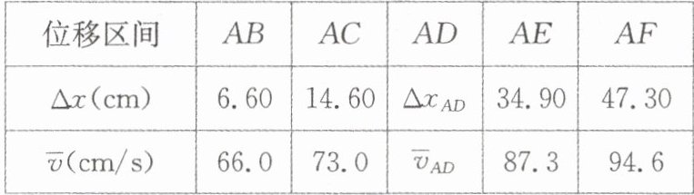 (1)已知打出图(b)中相邻两个计数点的时间间隔均为$0.1s$。以打出$A$点时小车位置为初始位置,将打出$B$、$C$、$D$、$E$、$F$各点时小车的位移$\Delta x$填到表中,小车发生相应位移所用时间和平均速度分别为$\Delta t$和$\overline{v}$,表中$\Delta x_{AD}=$
