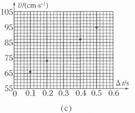 $cm/s$。(2)根据表中数据得到小车平均速度$\overline{v}$随时间$\Delta t$的变化关系,如图(c)所示。在图中补全实验点。