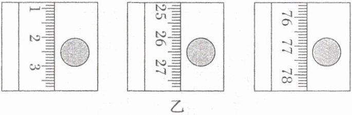 (3)停止摄像,从视频中截取三帧图片,图片中的小球和刻度如图乙所示。已知所截取的图片相邻两帧之间的时间间隔为$\frac{1}{6}s$,刻度尺的分度值是$1mm$,由此测得重力加速度为