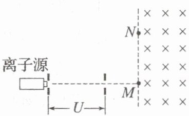 【例 1】如图,从离子源产生的甲、乙两种离子,由静止经加速电压$U$加速后在纸面内水平向右运动,自$M$点垂直于磁场边界射入匀强磁场,磁场方向垂直于纸面向里,磁场左边界竖直。已知甲种离子射入磁场的速度大小为$v_1$,并在磁场边界的$N$点射出;乙种离子在$MN$的中点射出;$MN$长为$l$。不计重力影响和离子间的相互作用。求: