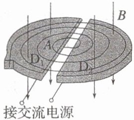 $D$形盒的缝隙处接交流电源,用于给粒子加速。