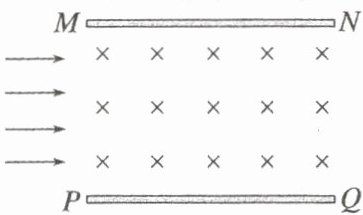 【例 4】(多选)(2024·湖北卷·9)磁流体发电机的原理如图所示,$MN$和$PQ$是两平行金属极板,匀强磁场垂直于纸面向里。等离子体(即高温下电离的气体,含有大量正、负带电粒子)从左侧以某一速度平行于极板喷入磁场,极板间便产生电压。下列说法正确的是