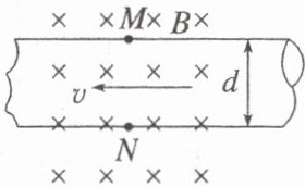 【例 5】(2024·黑龙江哈尔滨市四模)医院需要用到血液流量计检查患者身体情况。某种电磁血液流量计的原理可简化为如图所示模型。血液内含有少量正、负离子,从直径为$d$的血管右侧流入,左侧流出,空间有垂直纸面向里、磁感应强度大小为$B$的匀强磁场,$M$、$N$两点之间的电压稳定时测量值为$U$,流量$Q$等于单位时间通过血管某横截面的液体的体积。下列说法正确的是