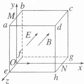 现代科学研究中,经常用磁场和电场约束带电粒子的运动轨迹,如图所示,有一棱长为 $ L $ 的正方体电磁区域 $ abcd - efgh $,其中 $ M $、$ N $ 分别为棱 $ ab $、棱 $ gh $ 的中点,以棱 $ ef $ 中点 $ O $ 为坐标原点、以 $ ON $ 为 $ x $ 轴正方向、$ OM $ 为 $ y $ 轴正方向、$ Oe $ 为 $ z $ 轴正方向建立三维坐标系 $ O - xyz $,正方体区域内可能单独或同时存在沿 $ z $ 轴负方向的匀强电场 $ E $ 及匀强磁场 $ B $,在 $ O $ 点有一粒子源,沿 $ x $ 轴正方向发射不同速率的带电粒子,粒子质量均为 $ m $,电荷量均为 $ +q $,且粒子入射速度在 $ 0.9v_0 \leq v \leq 3.3v_0 $ 范围内均匀分布,已知磁感应强度大小为 $ B = \frac{3mv_0}{2qL} $,电场强度大小为 $ E = \frac{81mv_0^2}{25\pi^2 qL} $,不计粒子的重力和粒子间的相互作用,取 $ \sqrt{3} = 1.732 $。