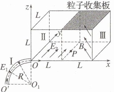 (2024·贵州贵阳市清华中学模拟)现代科技中常常利用电场和磁场来控制带电粒子的运动,某控制装置如图所示,区域Ⅰ是$\frac{1}{4}$圆弧形均匀辐向电场,半径为$R$的中心线$O'O$处的电场强度大小处处相等,且大小为$E_{1}$,方向指向圆心$O_{1}$;在空间坐标系$O - xyz$中,区域Ⅱ是棱长为$L$的正方体空间,该空间内充满沿$y$轴正方向的匀强电场$E_{2}$(大小未知);区域Ⅲ也是棱长为$L$的正方体空间,空间内充满平行于$xOy$平面,与$x$轴负方向成$45^{\circ}$夹角的匀强磁场,磁感应强度大小为$B$,在区域Ⅲ的上表面是一粒子收集板;一群比荷不同的带正电粒子以不同的速率先后从$O'$沿切线方向进入辐向电场,所有粒子都能通过辐向电场从坐标原点$O$沿$x$轴正方向进入区域Ⅱ,不计带电粒子所受重力和粒子之间的相互作用。