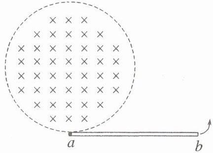 如图所示,在半径为 $ R $ 的圆形区域内存在垂直于平面向里的匀强磁场,磁感应强度大小为 $ B $,圆外无磁场。一根长为 $ 2R $ 的导体杆 $ ab $ 水平放置,$ a $ 端处在圆形磁场的下边界,现使杆绕 $ a $ 端以角速度 $ \omega $ 逆时针匀速旋转 $ 180° $,在旋转过程中(