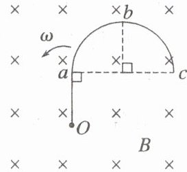 (2024·湖南卷·4) 如图,有一硬质导线 $ Oabc $,其中 $ \overset{\frown}{abc} $ 是半径为 $ R $ 的半圆弧,$ b $ 为圆弧的中点,直线段 $ Oa $ 长为 $ R $ 且垂直于直径 $ ac $。该导线在纸面内绕 $ O $ 点逆时针转动,导线始终在垂直纸面向里的匀强磁场中。则 $ O $、$ a $、$ b $、$ c $ 各点电势关系为(